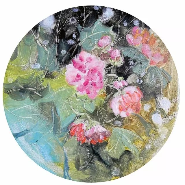 绘画技法上巧妙地融合传统国画大写意、西方绘画色彩及易经风水构图,加之家传的捻条画的运用从而形成了独具特色的意象绘画风格。